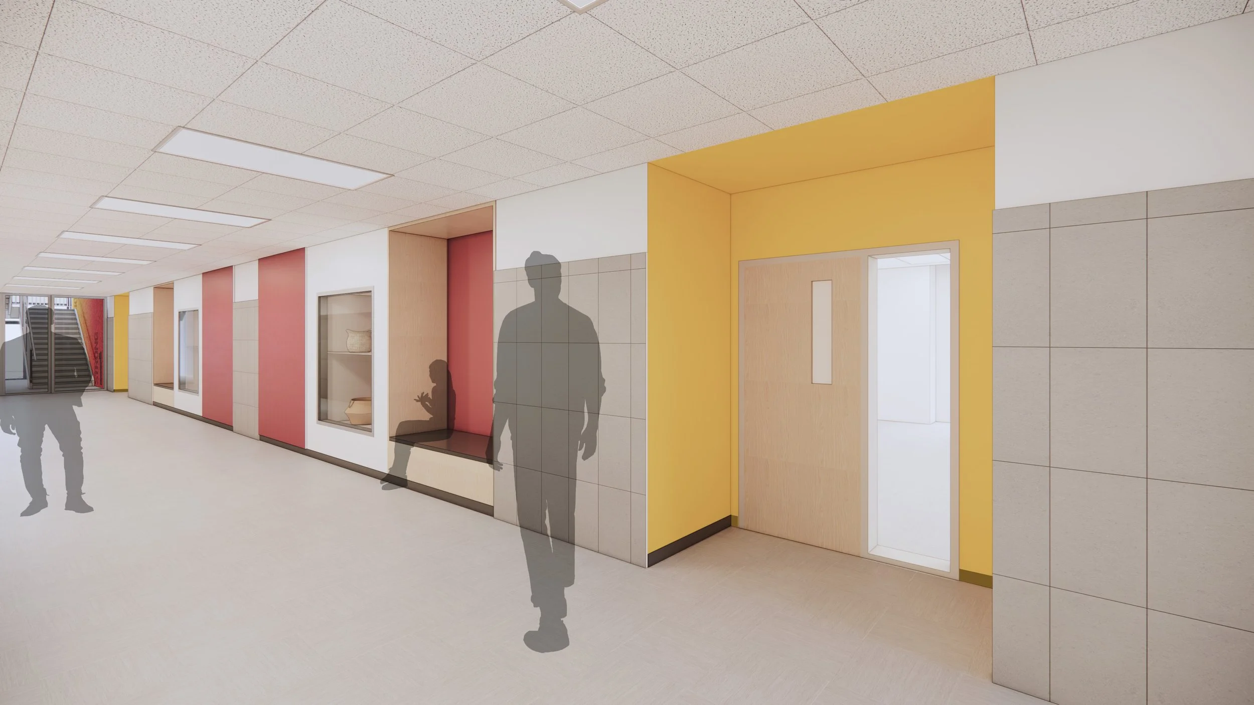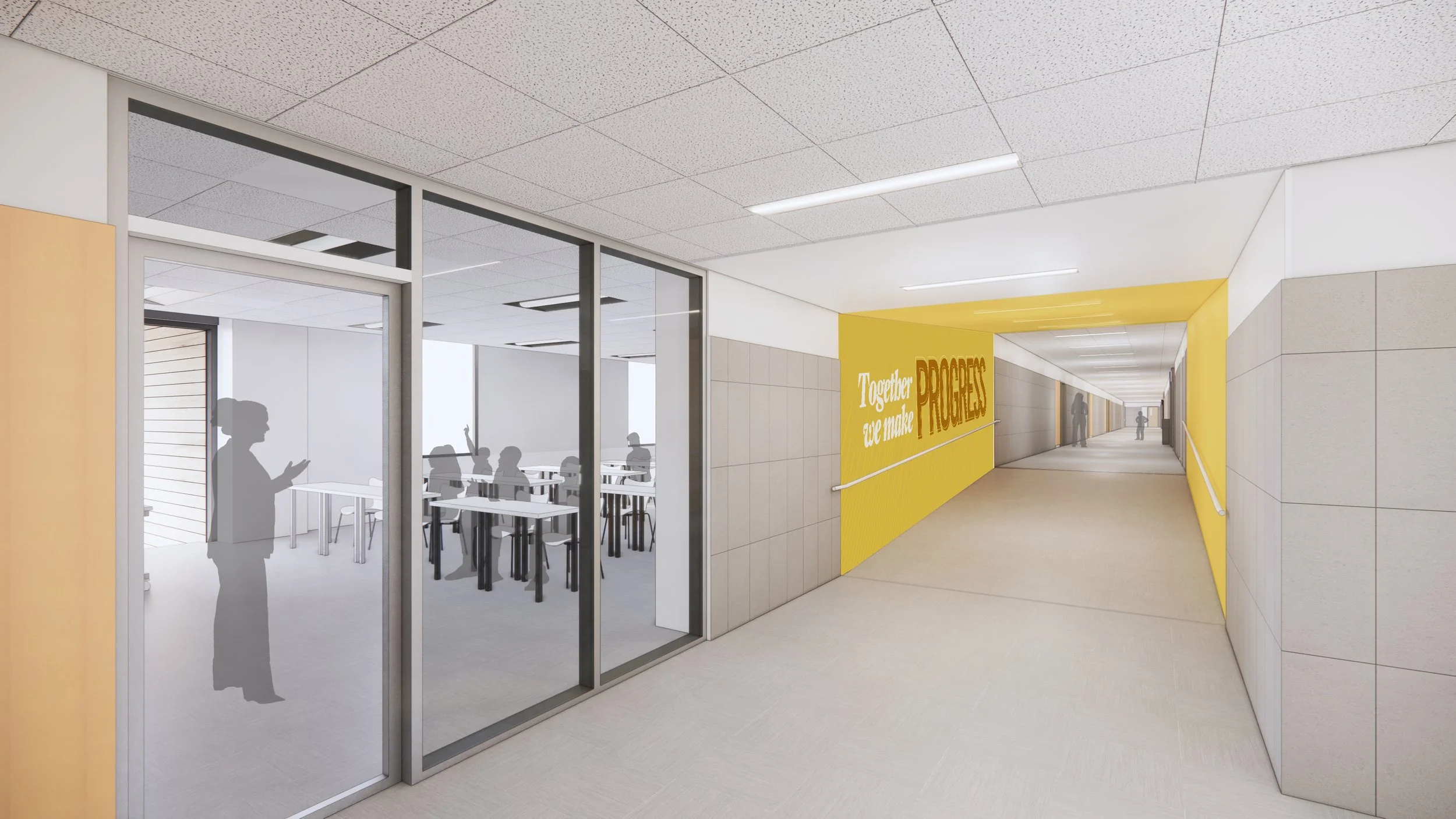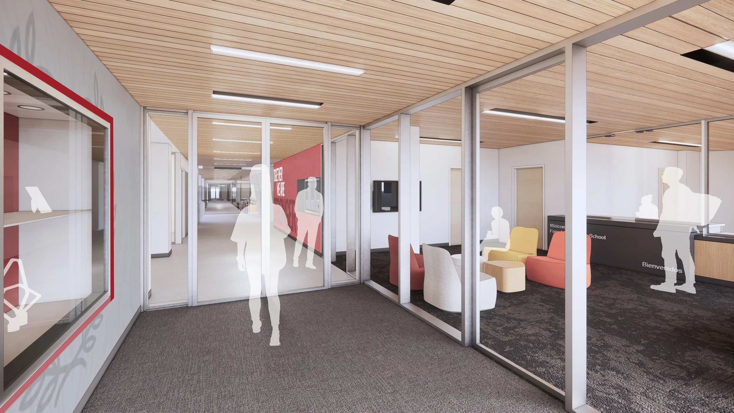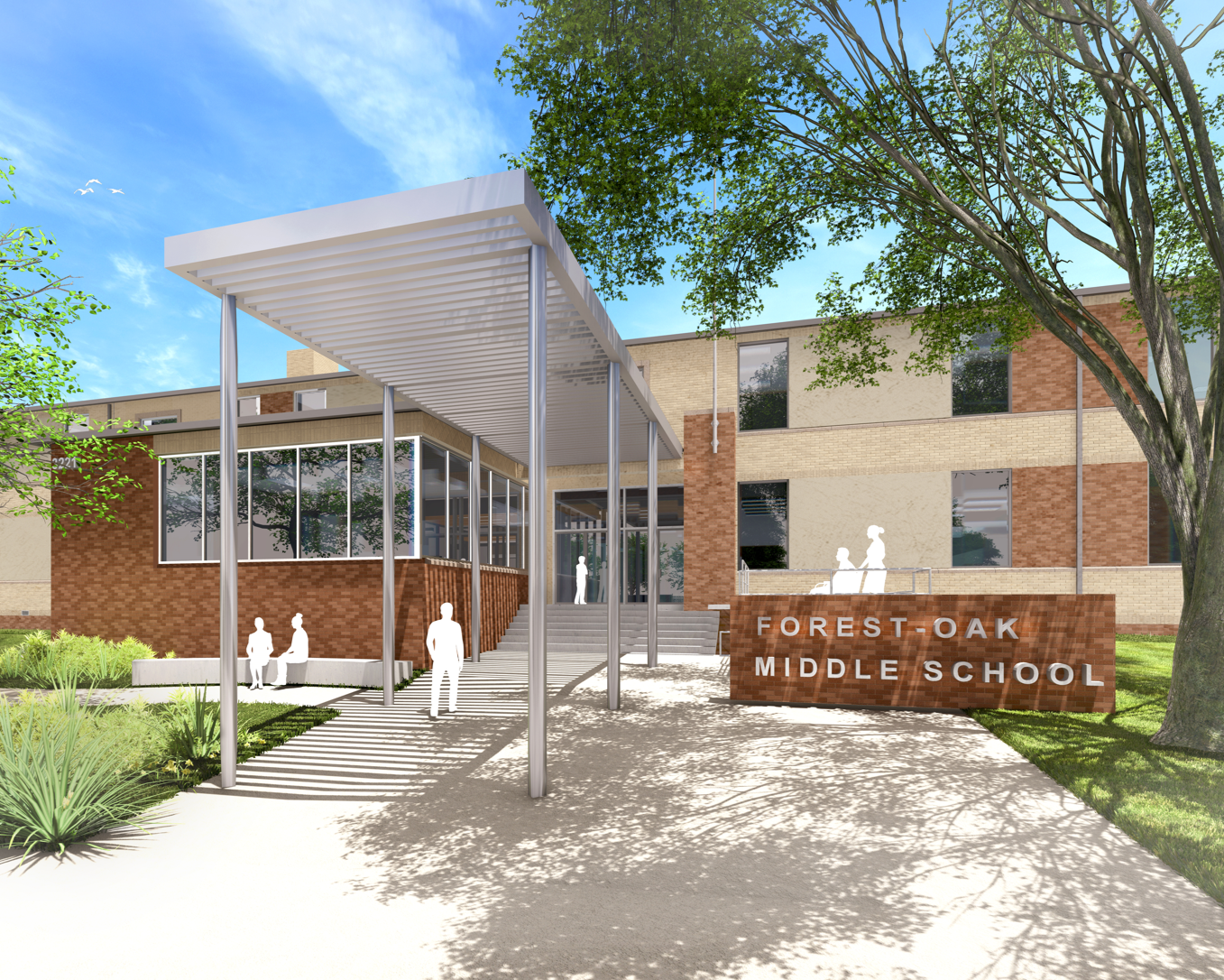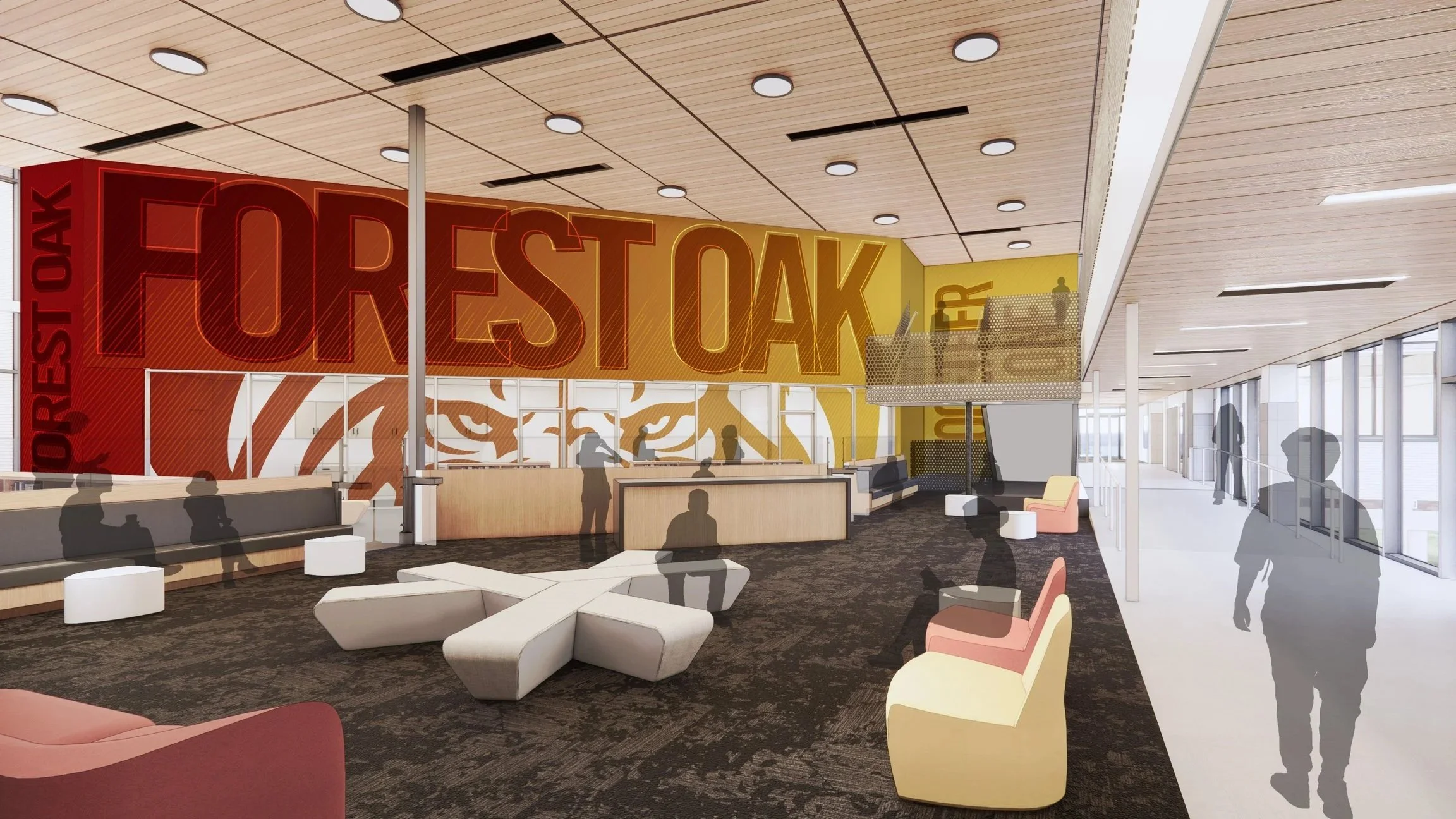 The key aspiration of our project at Forest Oak is to connect a disjointed campus and establish a unifying language for ease of navigation. Comprised of multiple additions, the current campus is in need of more classrooms and an upgrade for their Media Center which resides in a temporary metal building. Our intervention revolves around a new Media Center which serves as a student hub and connecting gasket between the existing buildings and a new classroom wing. Custom millwork elements in this space allow an open experience while addressing access concerns. Renovations to the 1953 and 1956 built wings traverse grade change and manage narrow corridors as budget restrictions mandated the maintaining of existing structural elements. The interiors team collaborated with our Branded Environments studio to create a new school identity to foster pride and belonging.