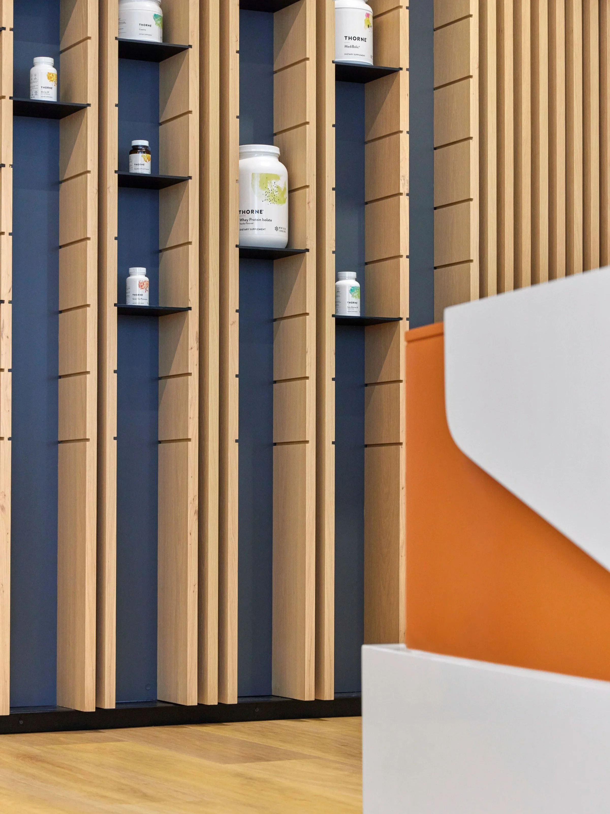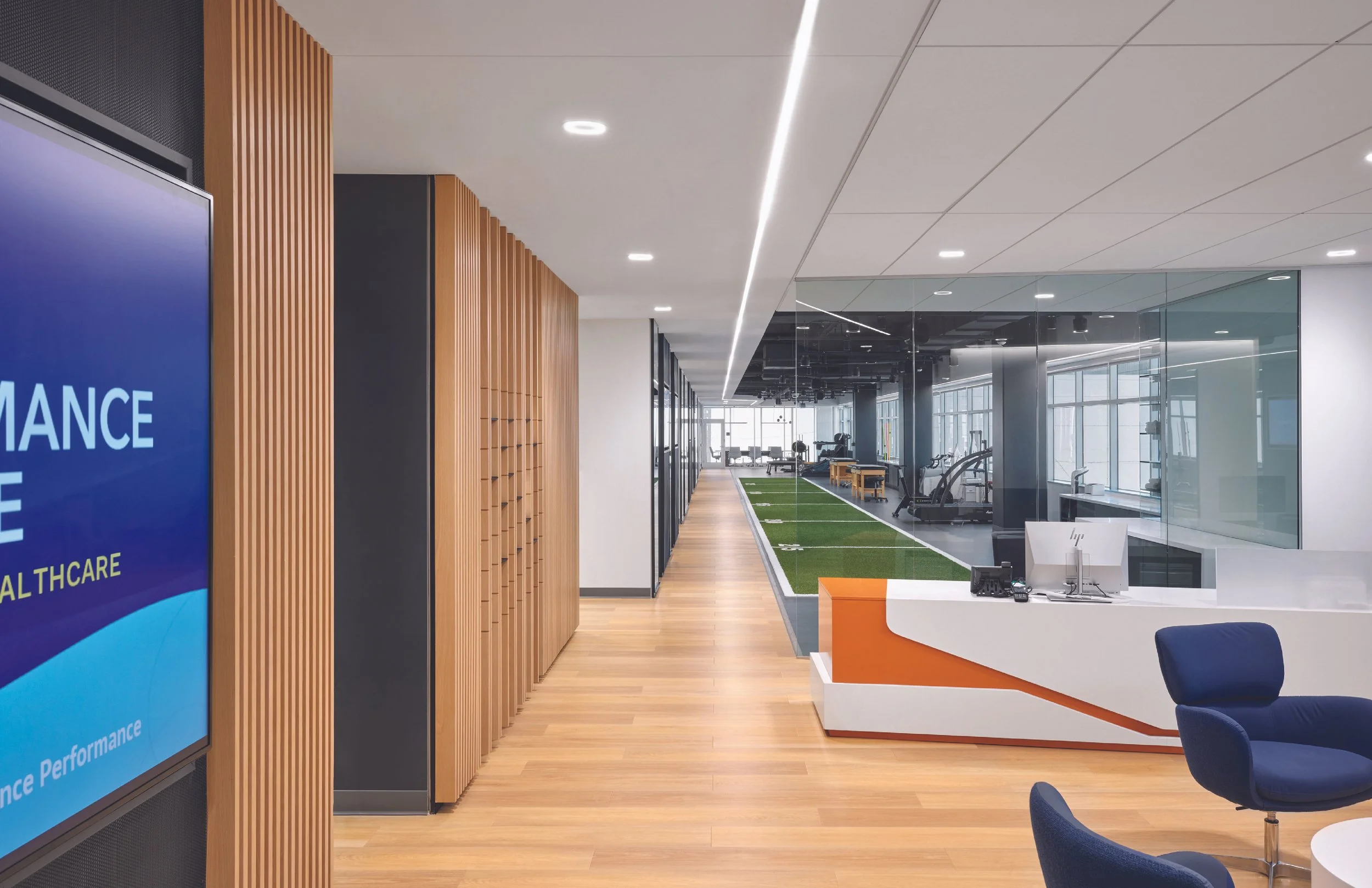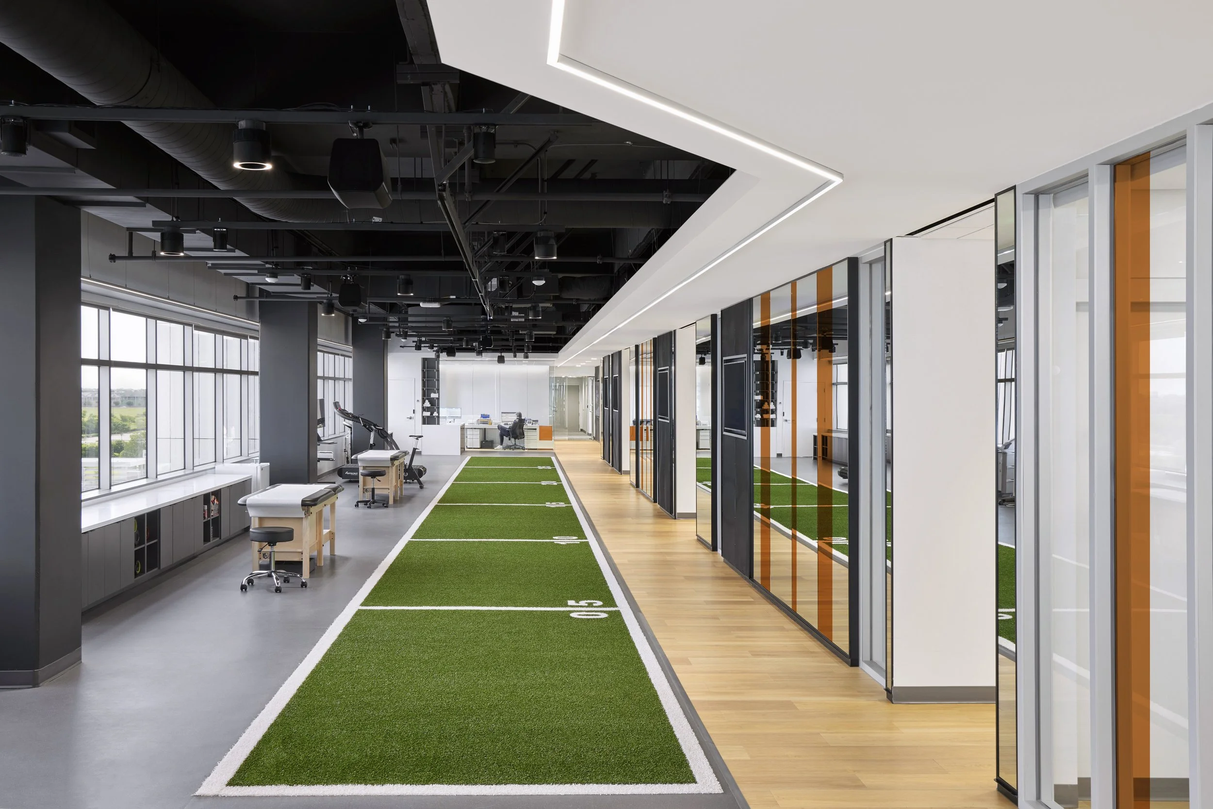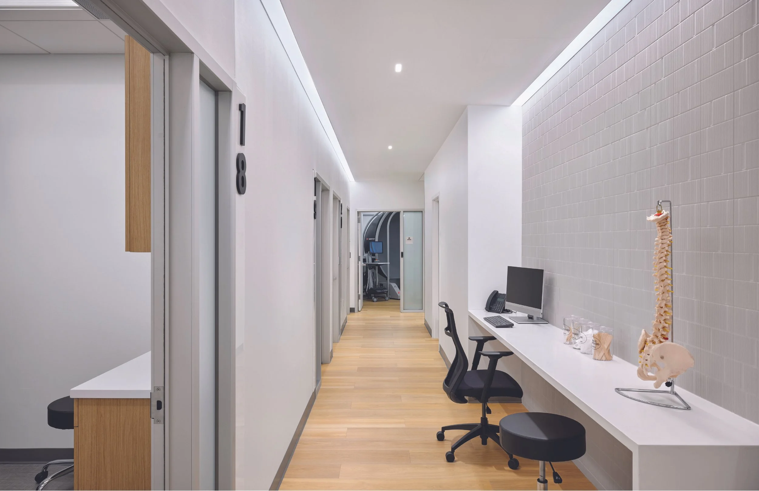 The performance clinic, teaching outpost for a prominent chiropractic school in Dallas, combines sports medicine with industry-leading chiropractic techniques and experimental neurological therapies. Located in a medical office building, our team was tasked with the interior fit-out of a previously occupied suite. Its program consists of two distinct zones: active treatment and quiet clinic. The design organizes around a circulation spine that subdivides the two zones. Warm wood flooring threads together the dual aesthetics of sterile clinic corridor and the industrial athletic rehab floor. Circulation paths are set up for patients to move freely between zones or enter each one independently. The project was awarded an Excellence Award in the Healthcare Small category by IIDA Texas Oklahoma Chapter in 2023.
