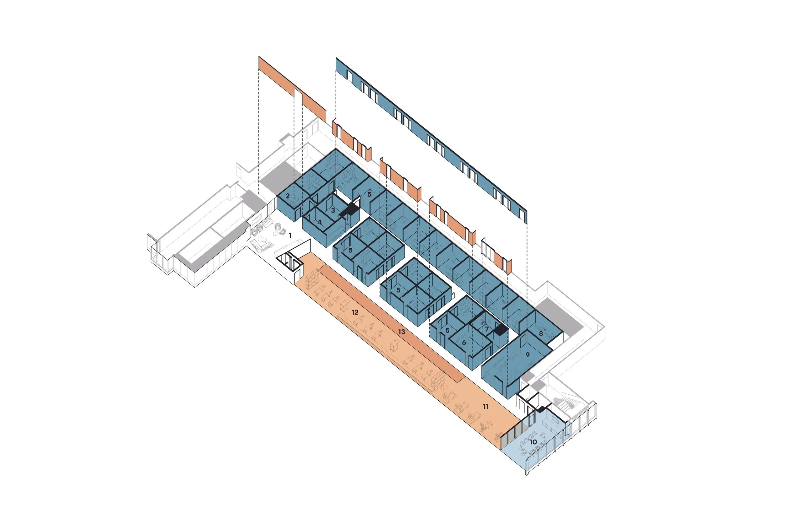 Axonometric diagram highlighting spatial organization.