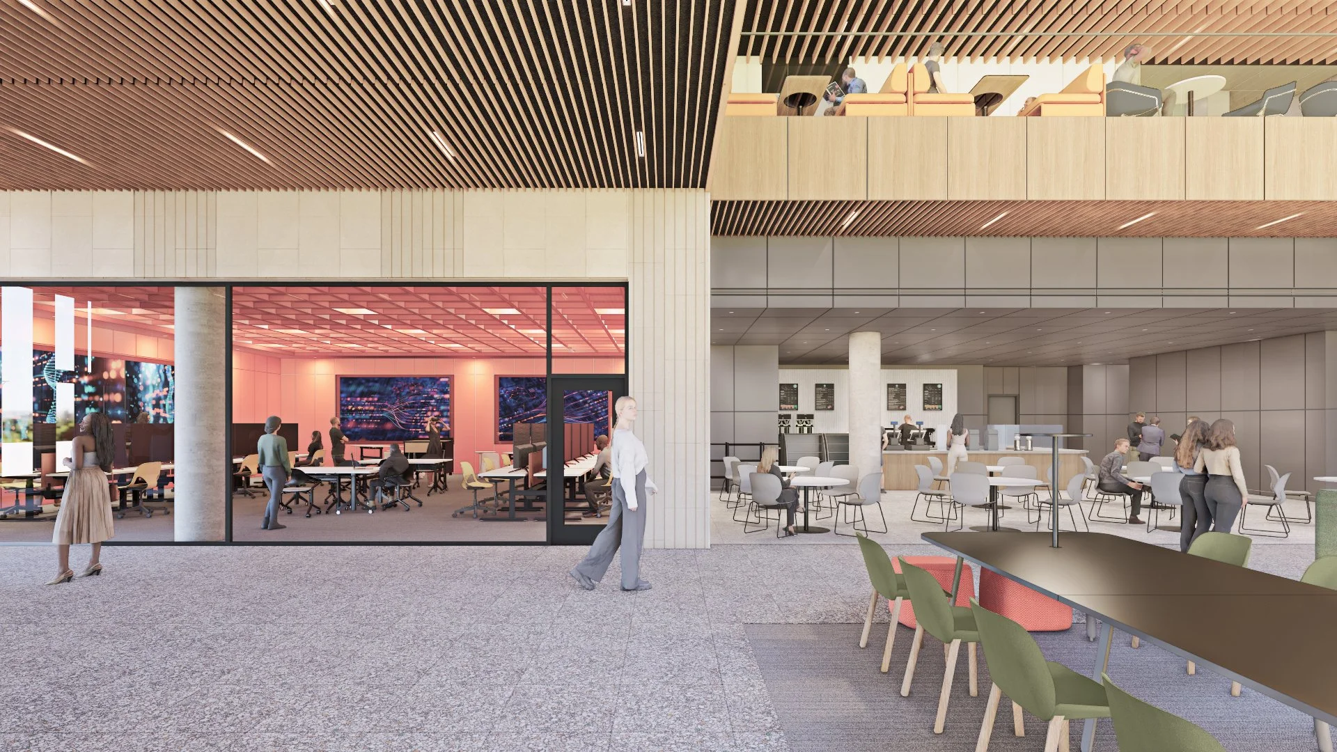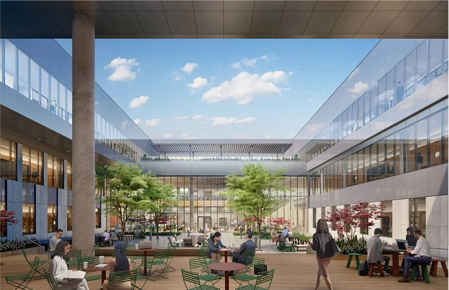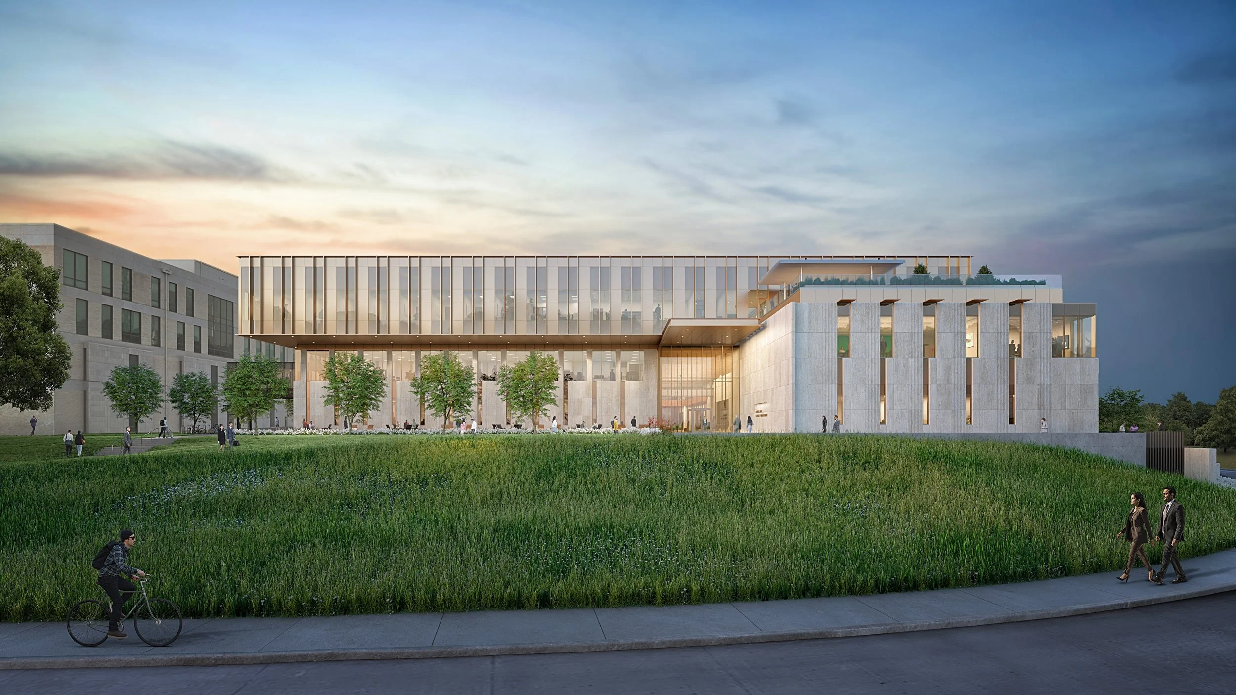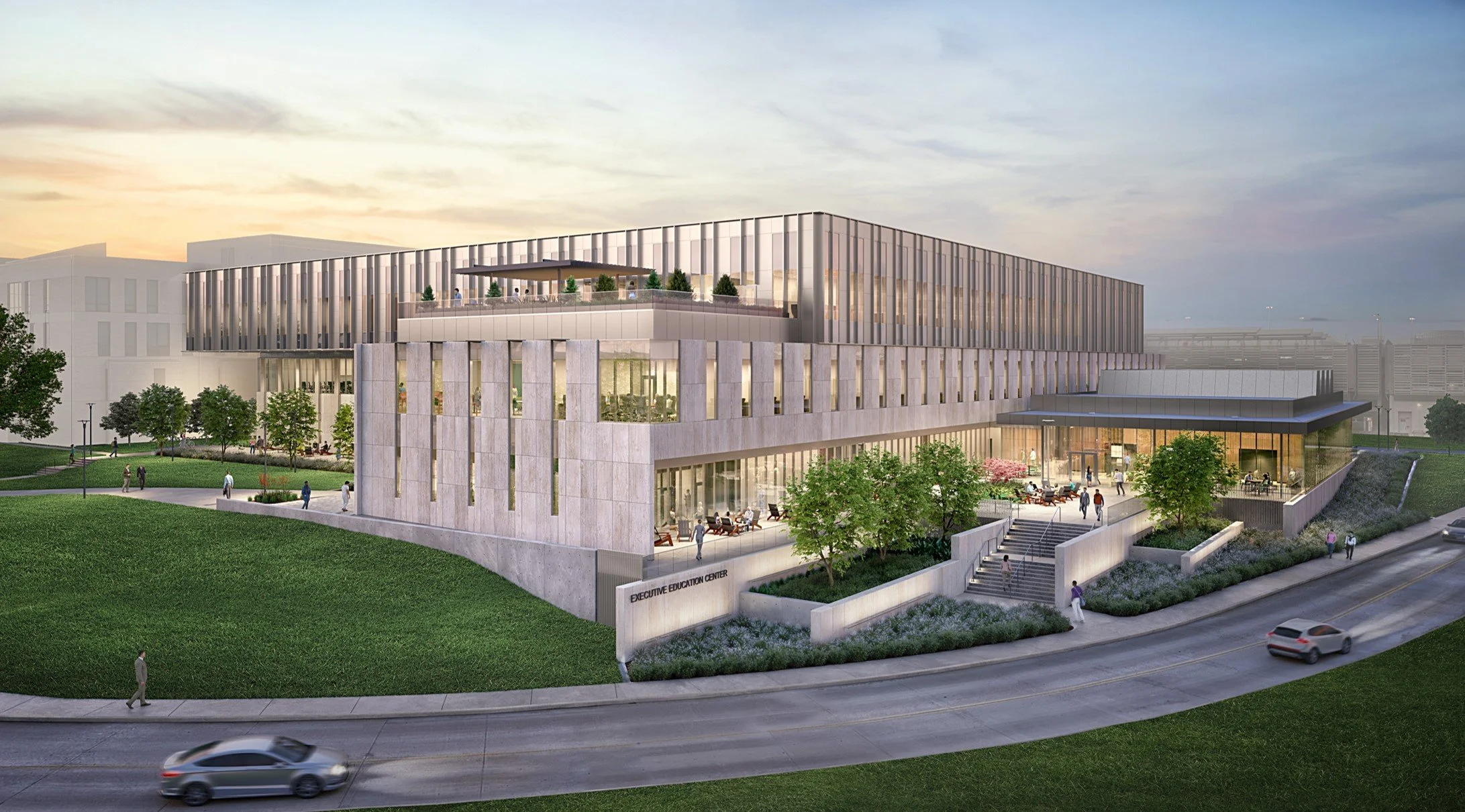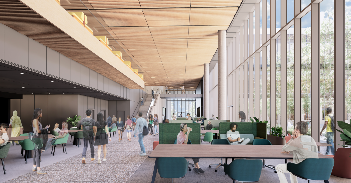 The third and final phase of a program that has been growing since 1975, the building aims to reflect the college's rise in reputation and the success of its graduates. Centering a quiet courtyard in a fast-paced business environment encourages students and faculty to pause and remain grounded to place through visual connection and material selection. The challenge of the program: to combine undergraduate and post-professional spaces under one roof without forcing them to cross paths; giving each their own identity. Bright and collaborative for the undergraduates. Warm and refined for the executives. The project is in pursuit of LEED Gold certification and is on track to be completed in 2026.