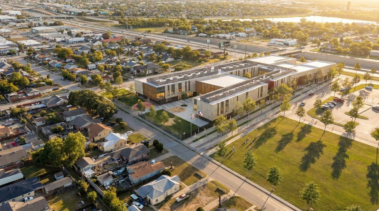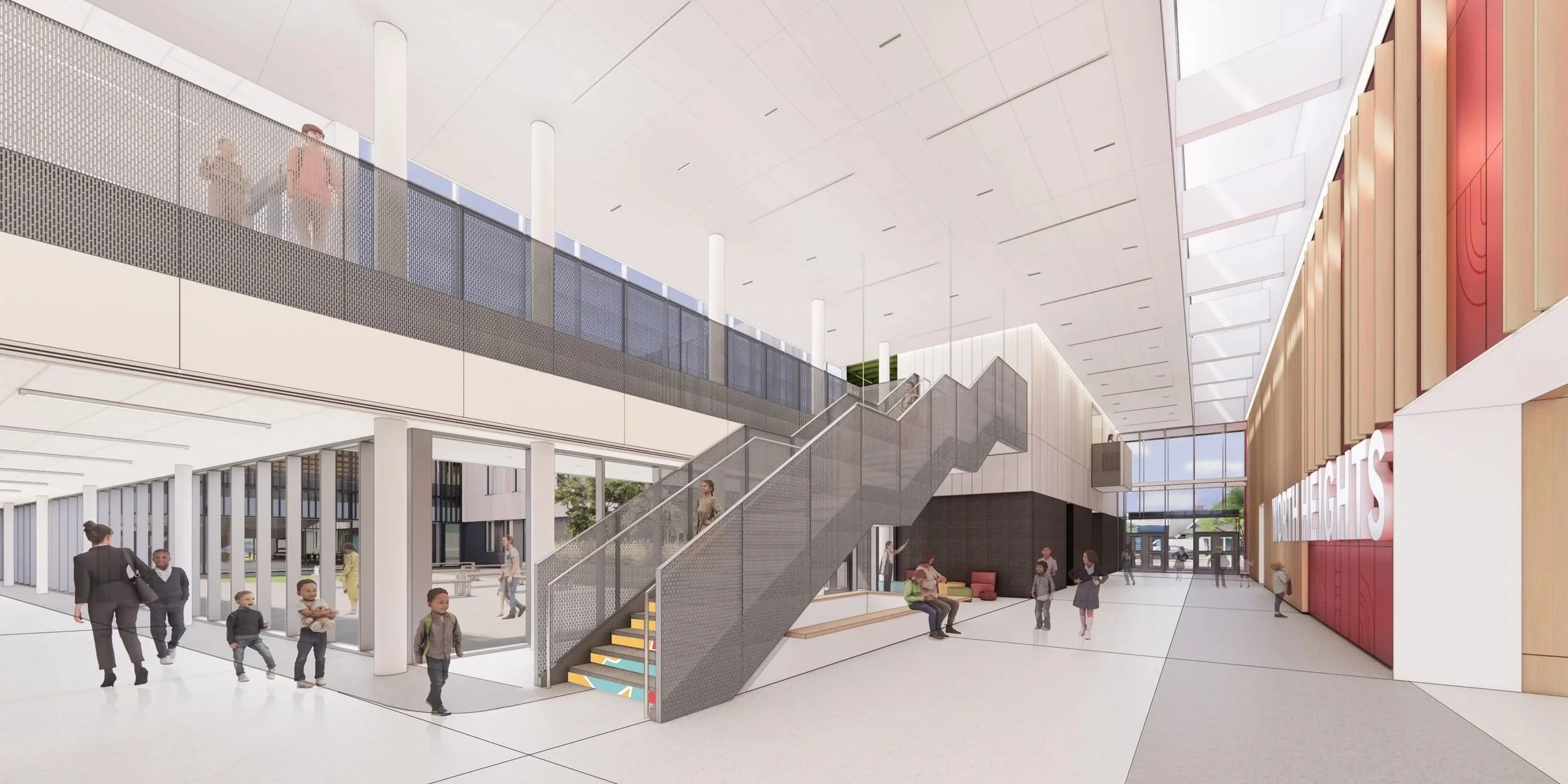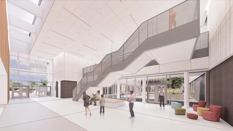 Situated in South Fort Worth, the Worth Heights neighborhood is growing and in need of a larger elementary school campus to support increased enrollment and the integration of students from a nearby closed school. The building is conceptualized as the Trailhead for a life-long journey of learning and exploration. Its two academic bars reach out to welcome the community, situating the media center as a jewel box within the landscape, while the noisier elements on the west side of the site buffer the school from a nearby highway and access road. The interior strategy is an extension of the architectural moves - material blur the lines between inside and outside, perforated metal guardrails maintain transparency and sightlines. The palette is neutral and grounded but contrasted by bold graphics, bright colors, and integrated wayfinding on floor and wall surfaces.